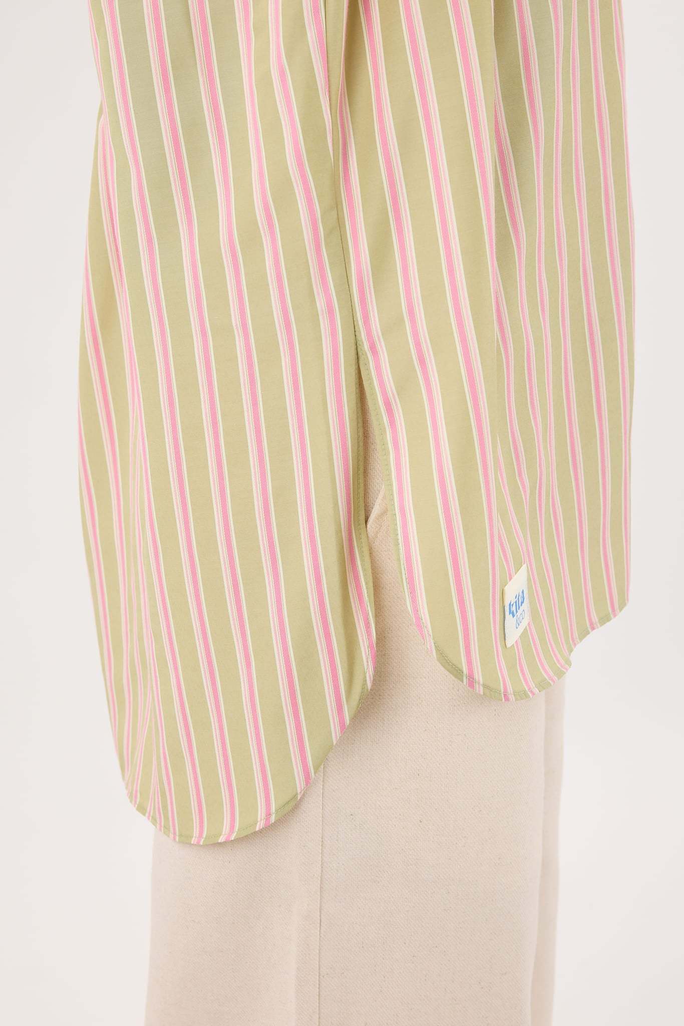 Collared Neckline: Comes with a traditional pointed collar, adding a refined touch to the casual striped design.