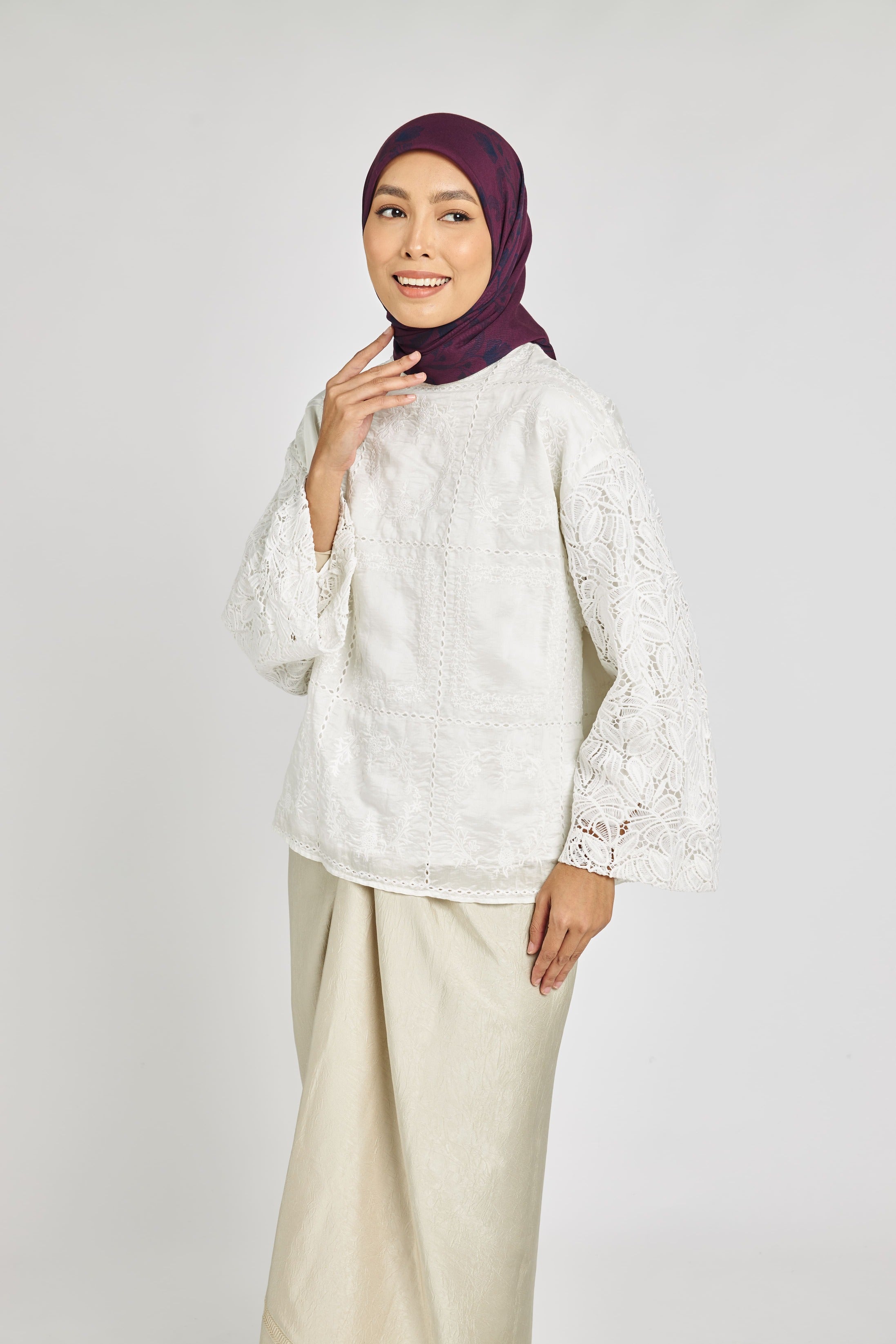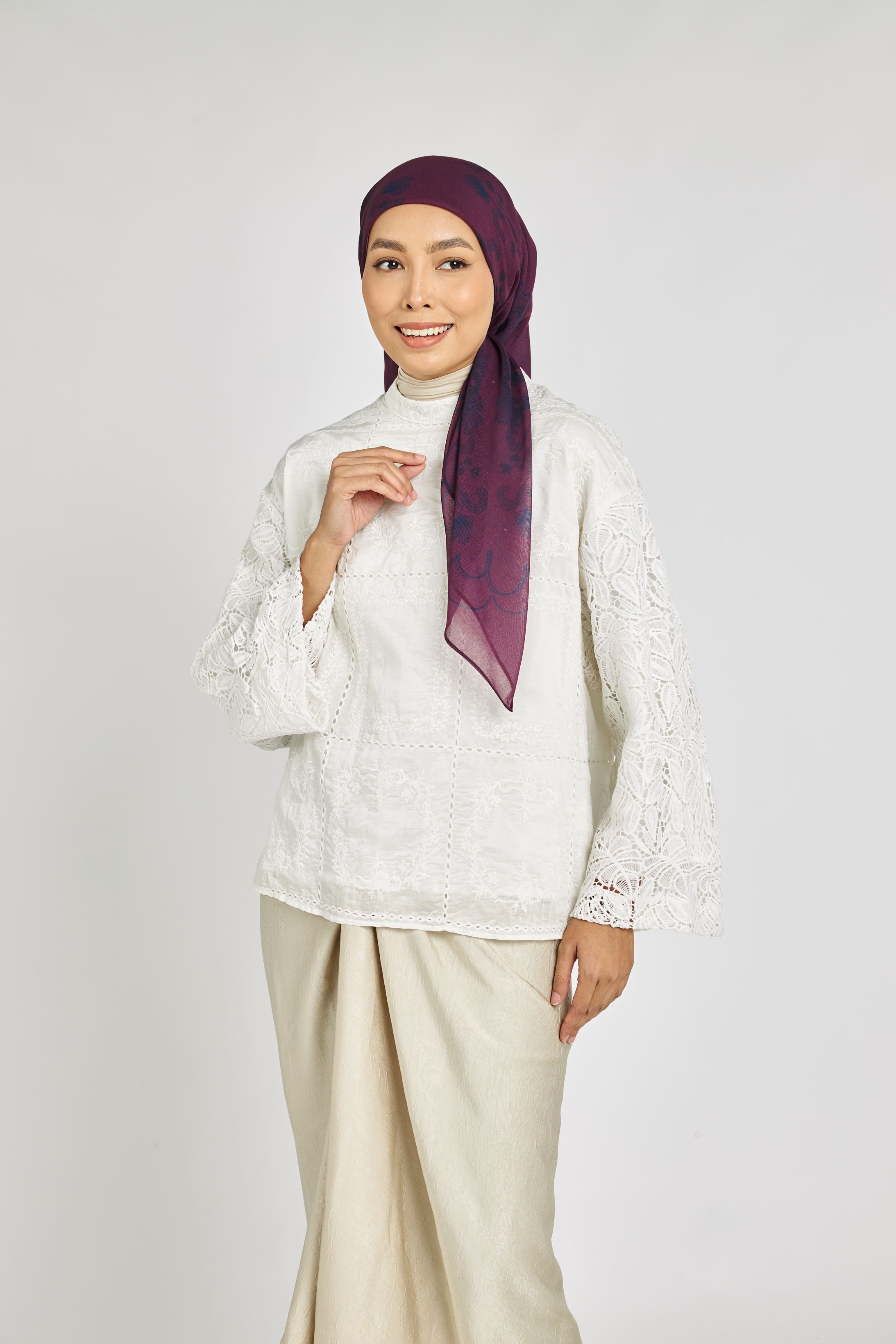 Our Raya 2024 collection is incomplete without our scarves! The Kusuma cotton voile scarves feature a traditional paisley floral design that makes it unique and elegant. From delicate details, a variety of styles, fresh colors - this is the scarf that you need to get for the festive season. Available in White, Nude and Maroon.